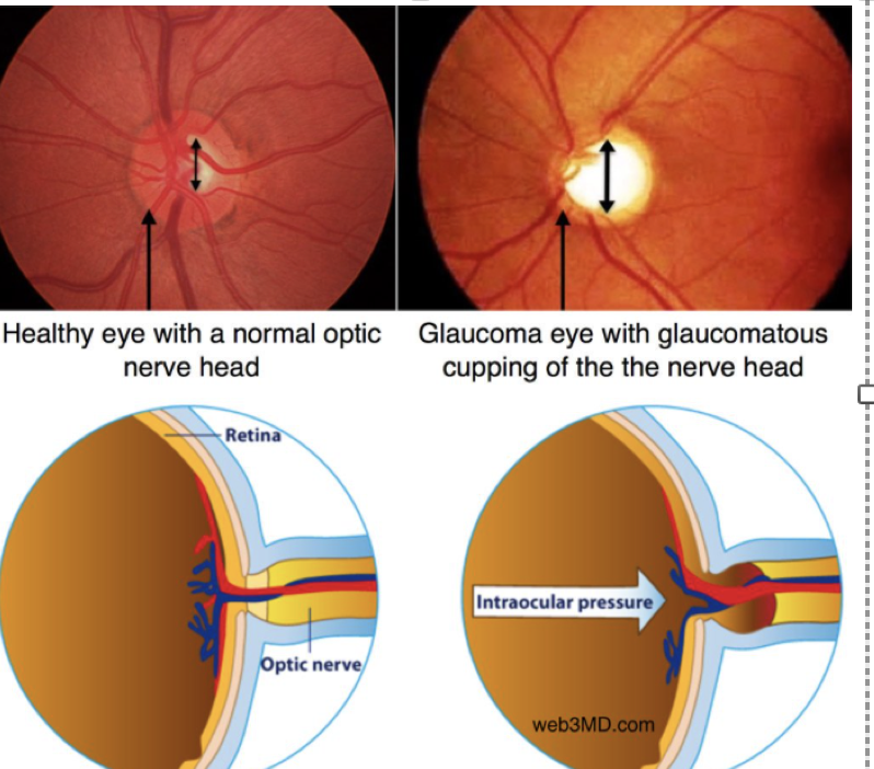 fixed, dilated pupil that is minimally responsive to light and cupping of the optic disc