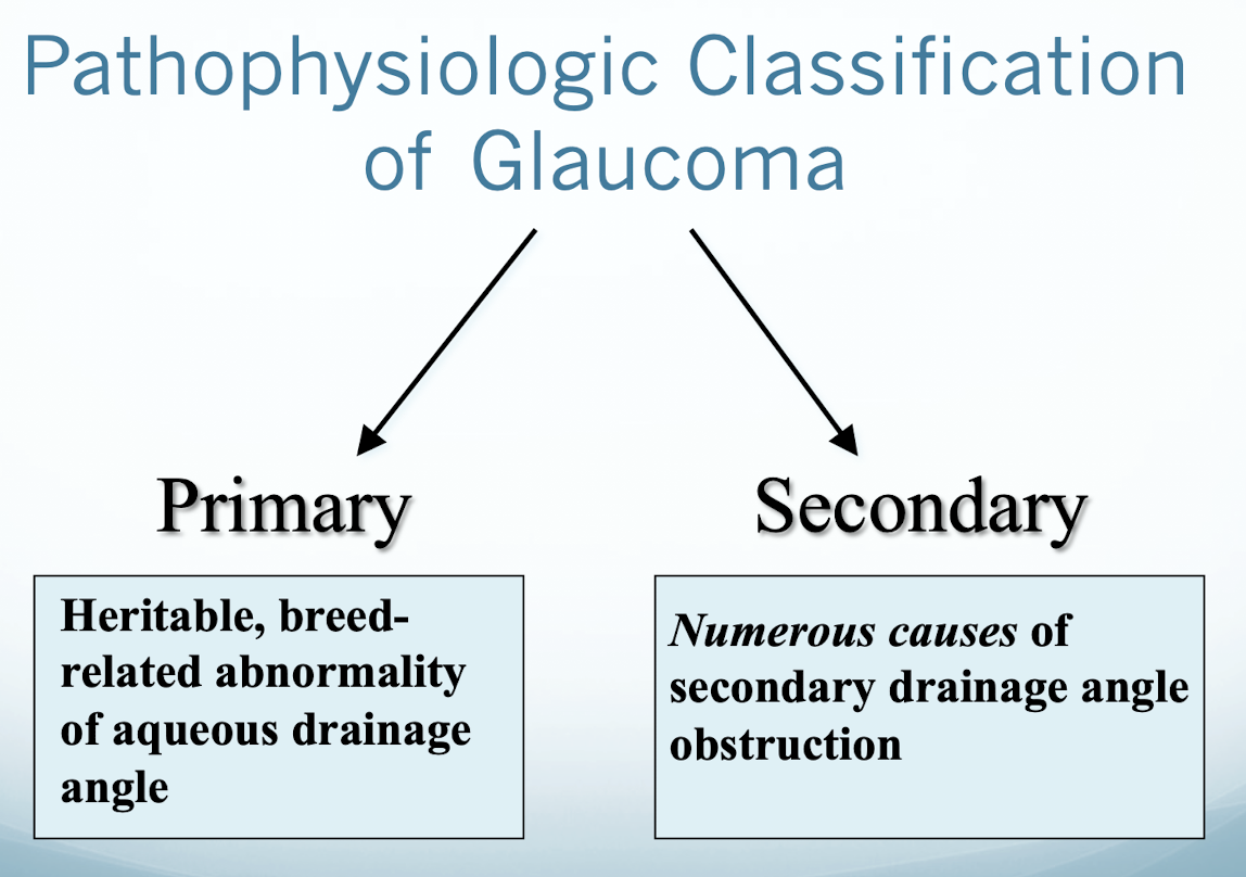 Secondary: lens luxation, uveitis, hyphema, intraocular neoplasis, melanocytic alucoma, pigmentary uveitis, trauma, etc.