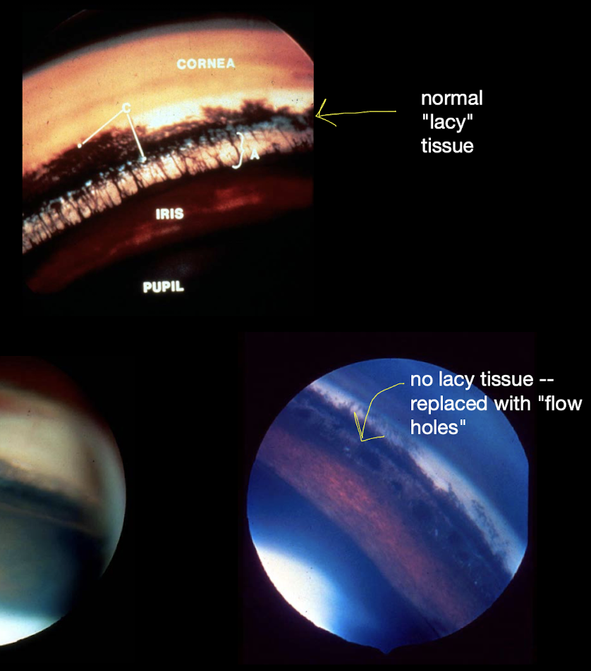 Specialized assessment of the filtration (drainage) angle; requires a specialized lens. Determines likelihood of animal having primary glaucoma based on angle morphology