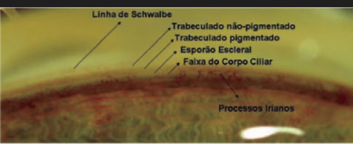 Linha de Schwalbe, trabeculado anterior (não pigmentado), Trabeculado posterior (pigmentado), esporão escleral e banda do corpo ciliar.