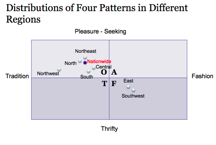 Within China, which regions are most thrifty (vs. pleasure-seeking) and who are fashion-seeking vs. traditional?