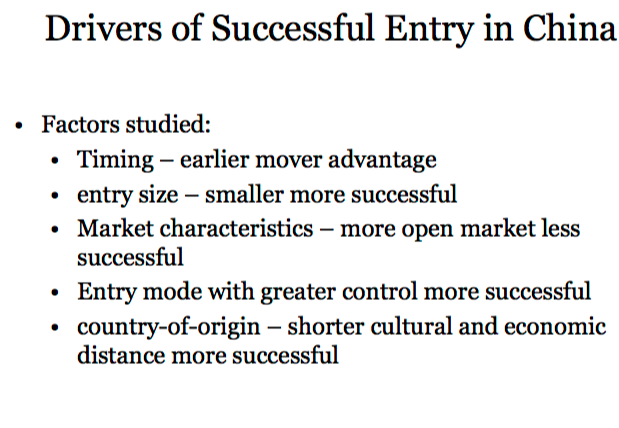 What are the drivers of successful entry in China according to the study from class?