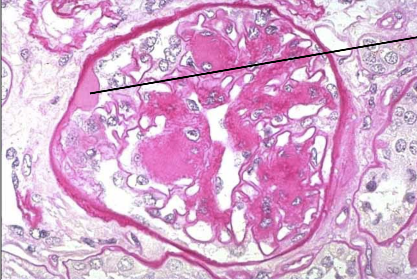 homogenous amorphous pink deposits of amyloid found in glomerulus, filling the tubules. Often found in the arteries.