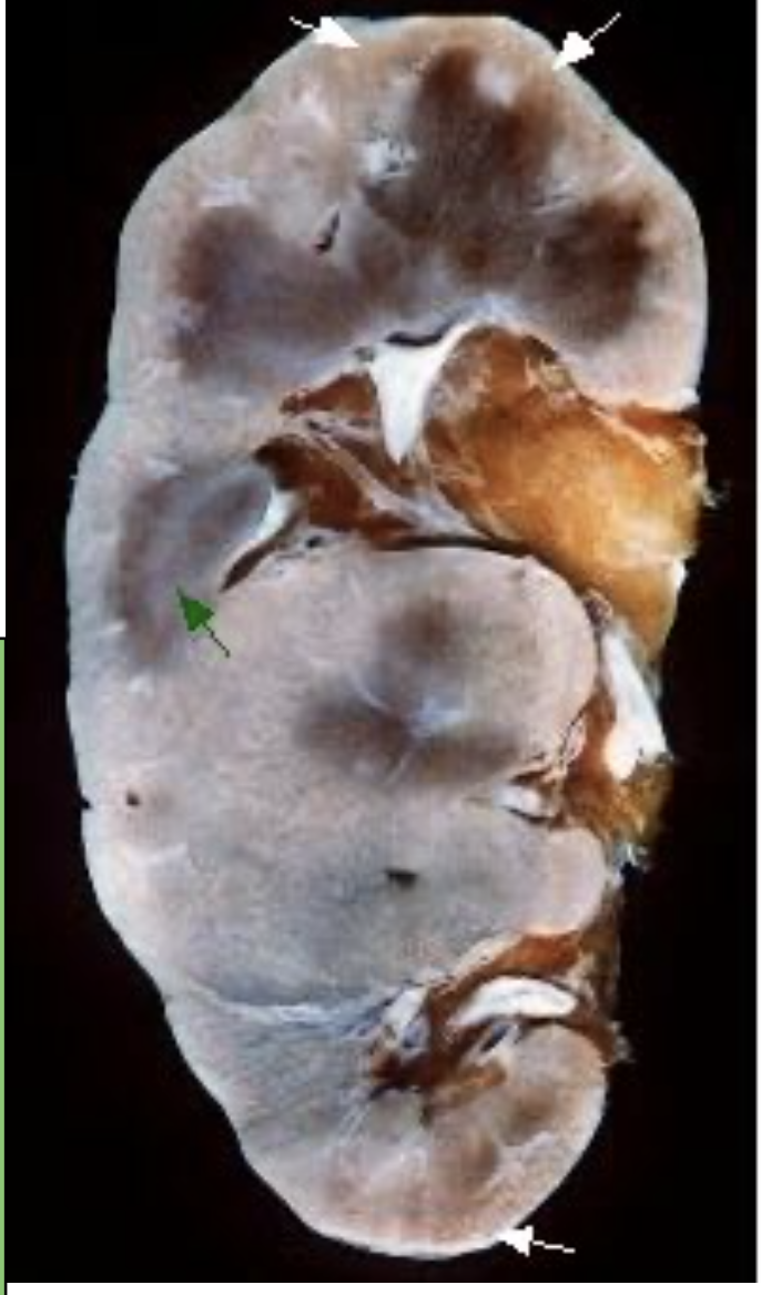 kidney generally enlarged: cortex is thickened by yellow-white deposits of amyloid white arrows and the blurry appearance of the medulla is also caused by amyloid infiltration (green arrows)