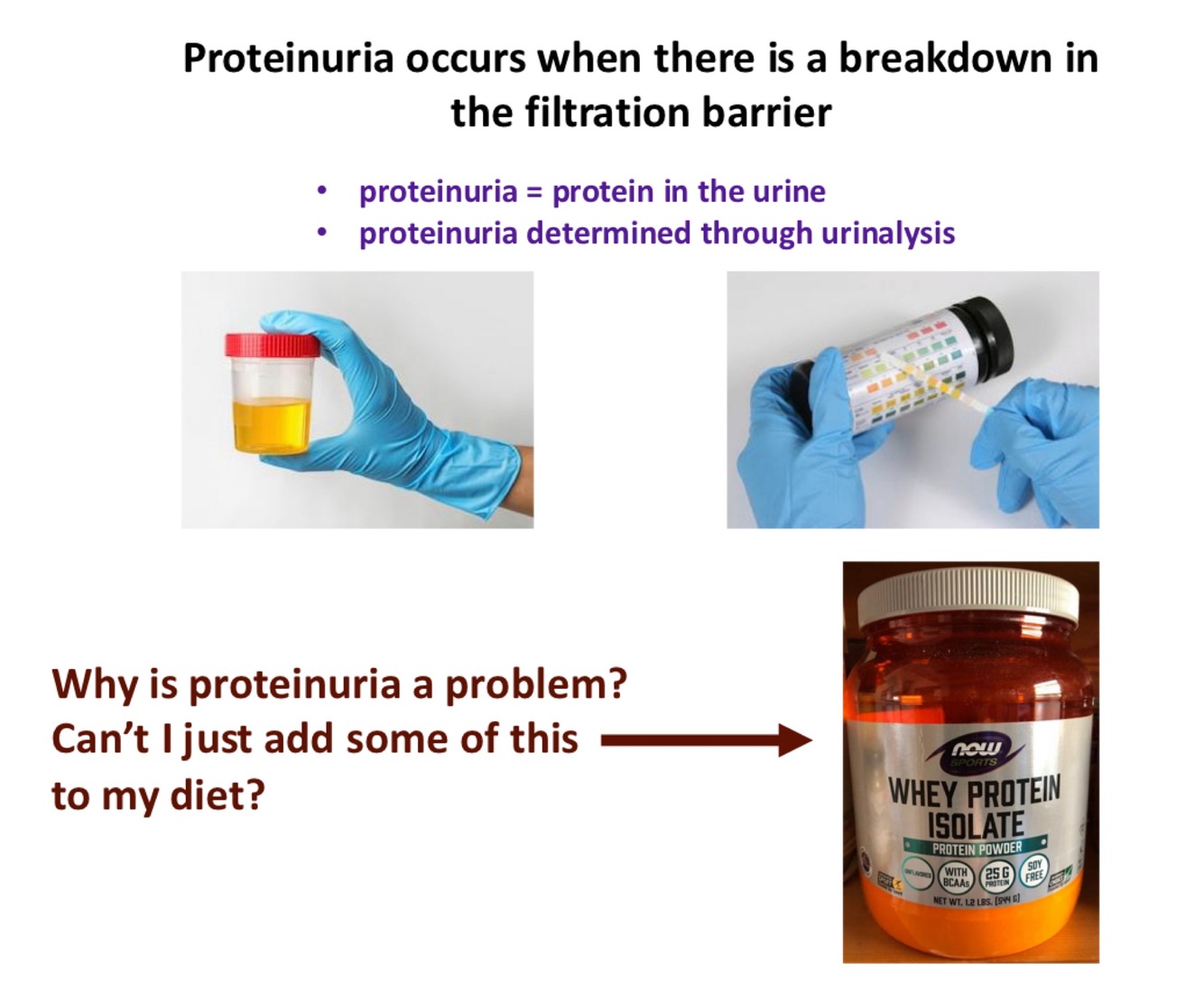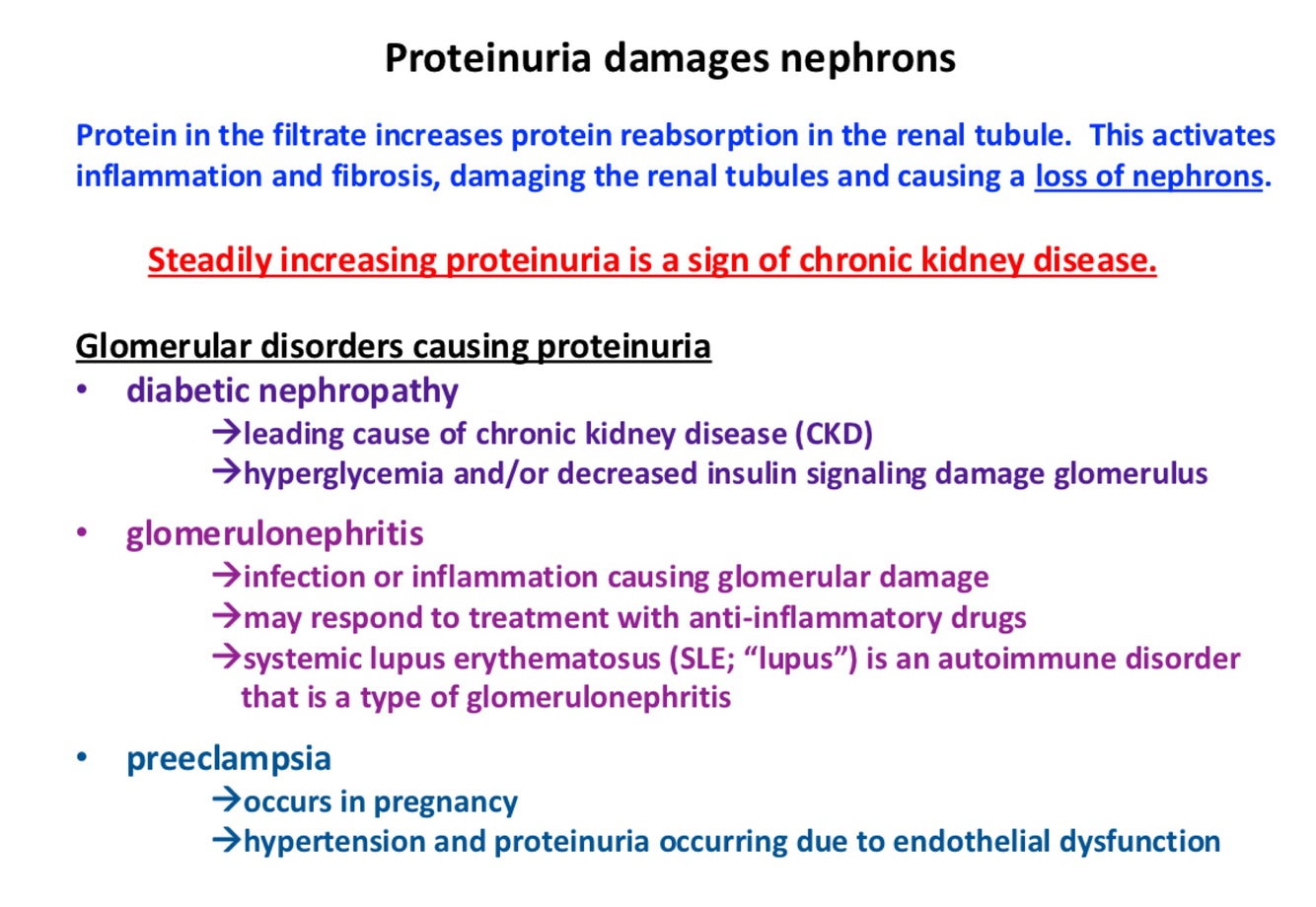 When protien appears in the urine, disease state. Happens when proteins are able to get filtered into urine, should NOT happen.
