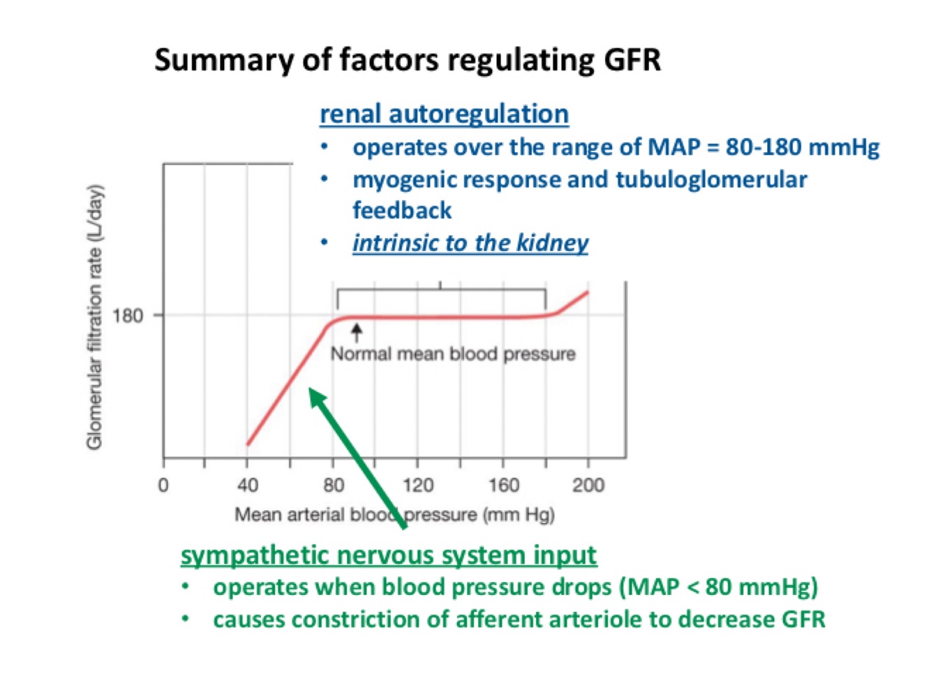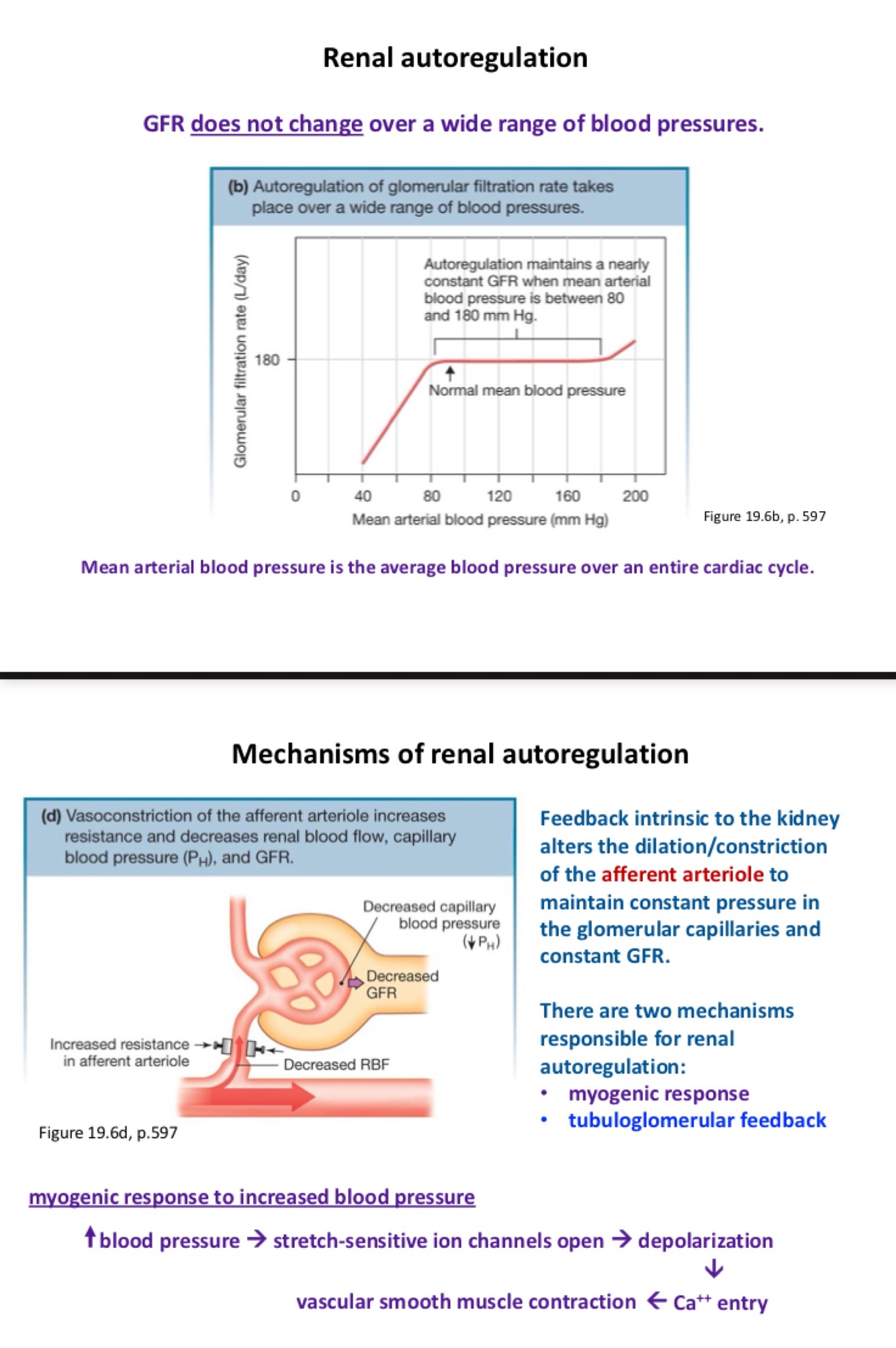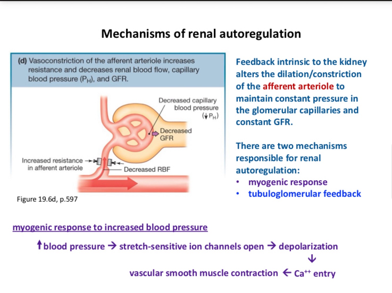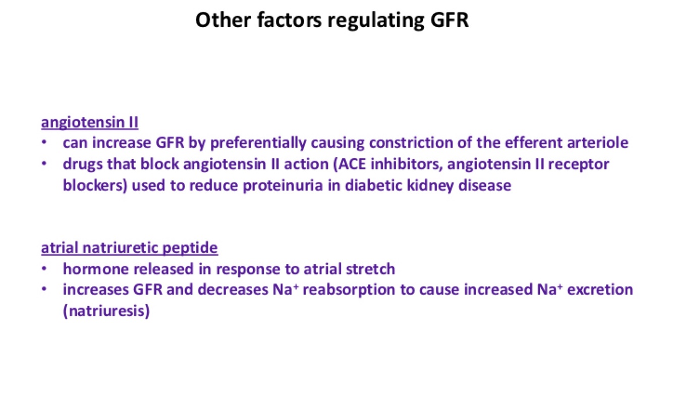 Afferent arterial is the gate keeper: regulating pressure by either squeezing down or opening. Myo=muscle(smooth). Stretch sensitive ion channels in muscle. High blood pressure= open ion channels… (pic)