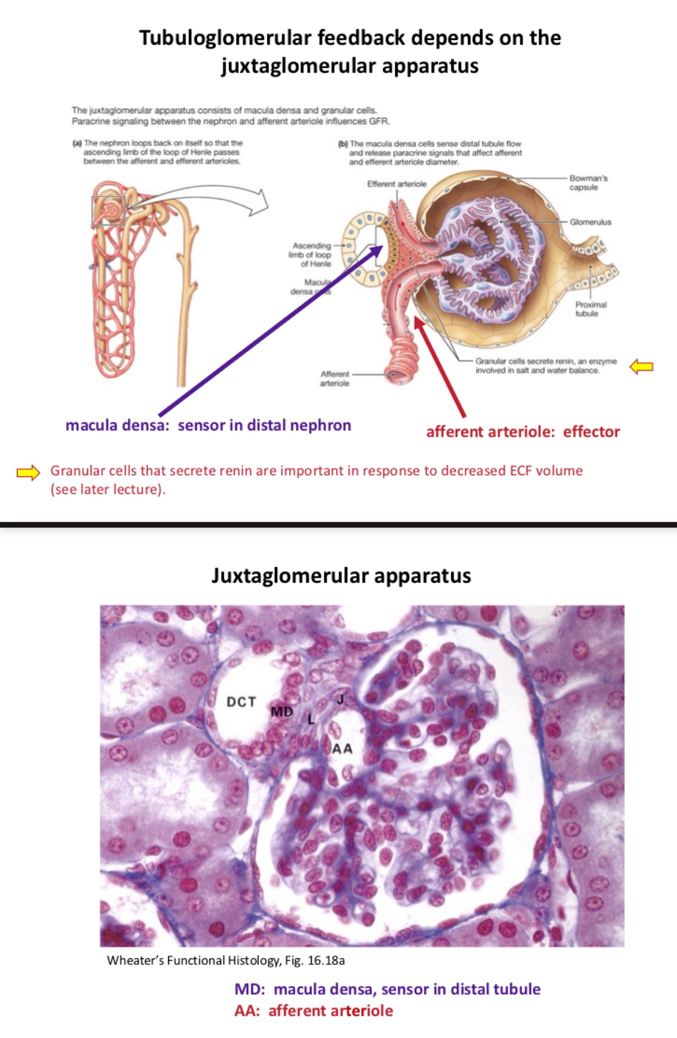Part of tubule from same nephron. Macula densa: senses flow/saltiness