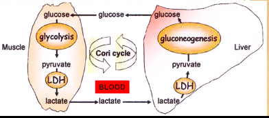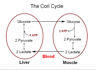 Cori cycle allows anaerboic respiration to occur in muscle tissue: glycolysis -> pyrvuate + 2ATP (net)