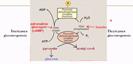 inhibits: pyruvate dehydrogenase complex (prevents pyruvate being turned into acteyl co A & sparing it, leaving for gluconeogenesis)