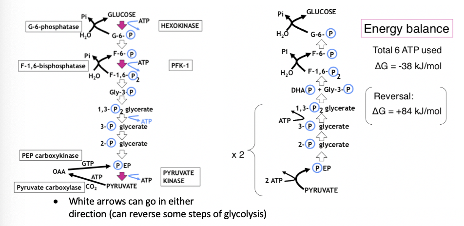 Irreversible reaction 1 :(PEP –> pyruvate)- can’t do this in 1 step so need an alternative pathway
