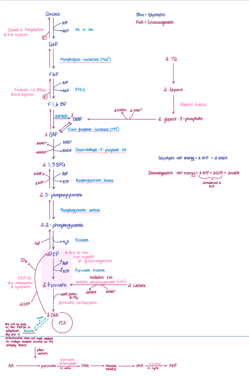 There are 3 rate limiting steps in glycolysis. So in gluconeogenesis, it has to bypass all 3 rate limiting steps/enzymes. What are the 3 steps of glycolysis and RLEs?