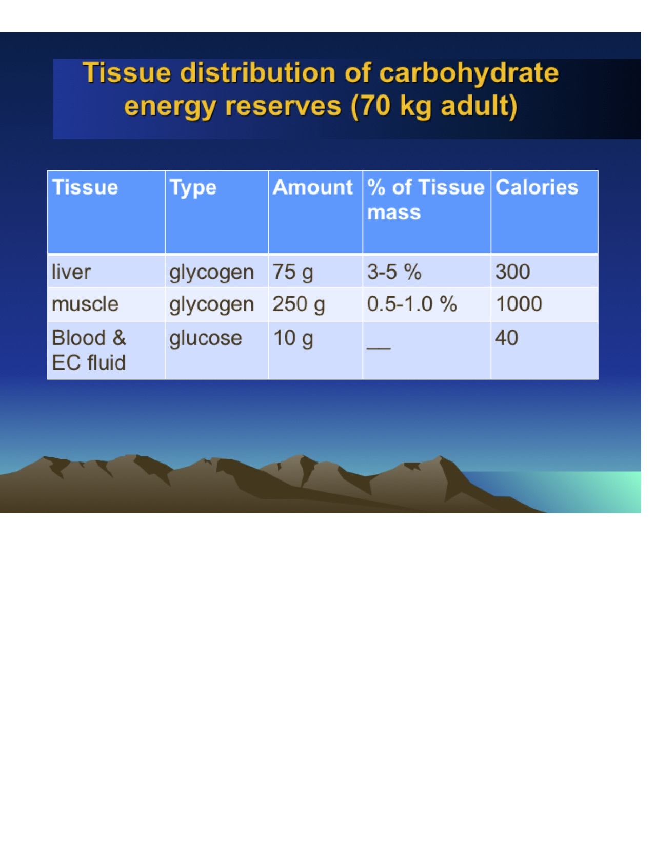 Tissue distribution of energy reserves (70Kg adult)? (4)