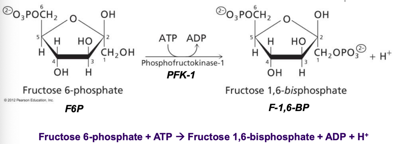 -converts fructose 6-phosphate into fructose 1,6-bisphosphate (addition of another phosphate group)
