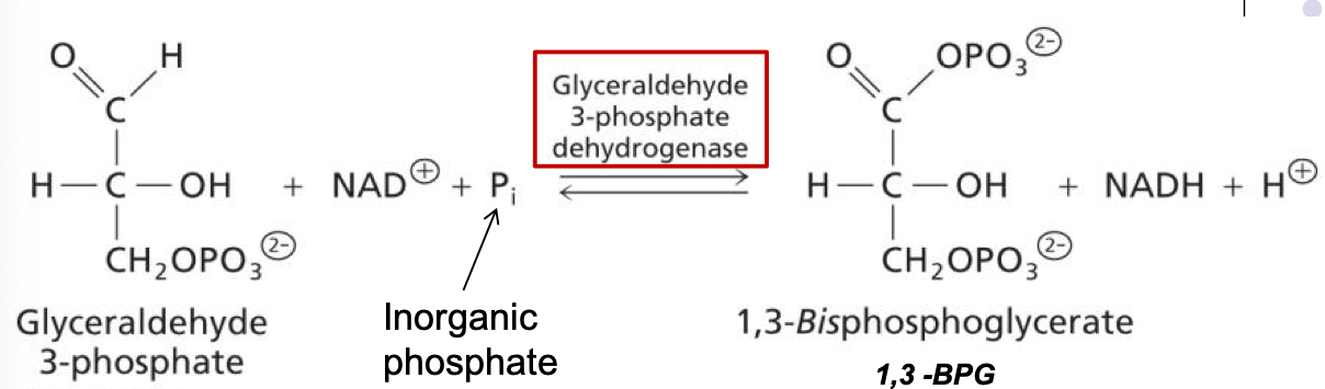 -converts glyceraldehye 3-phosphate into 1,3-biphosphoglycerate (addition of phosphate)