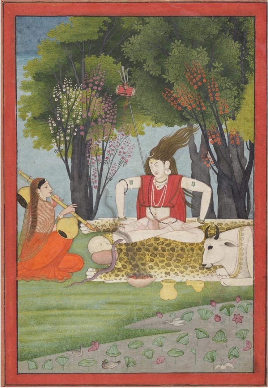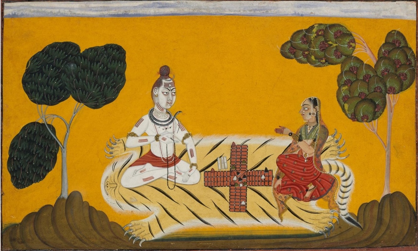 Siva and Parvati go away together to medtitate. In between they rest and play dice.