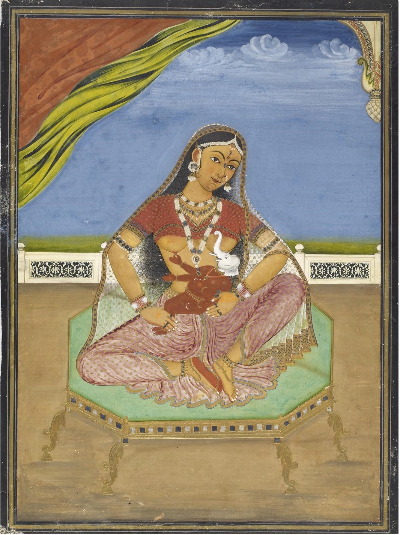 Parvati meditating, 2 laidies in waiting offer food, she rejects it
