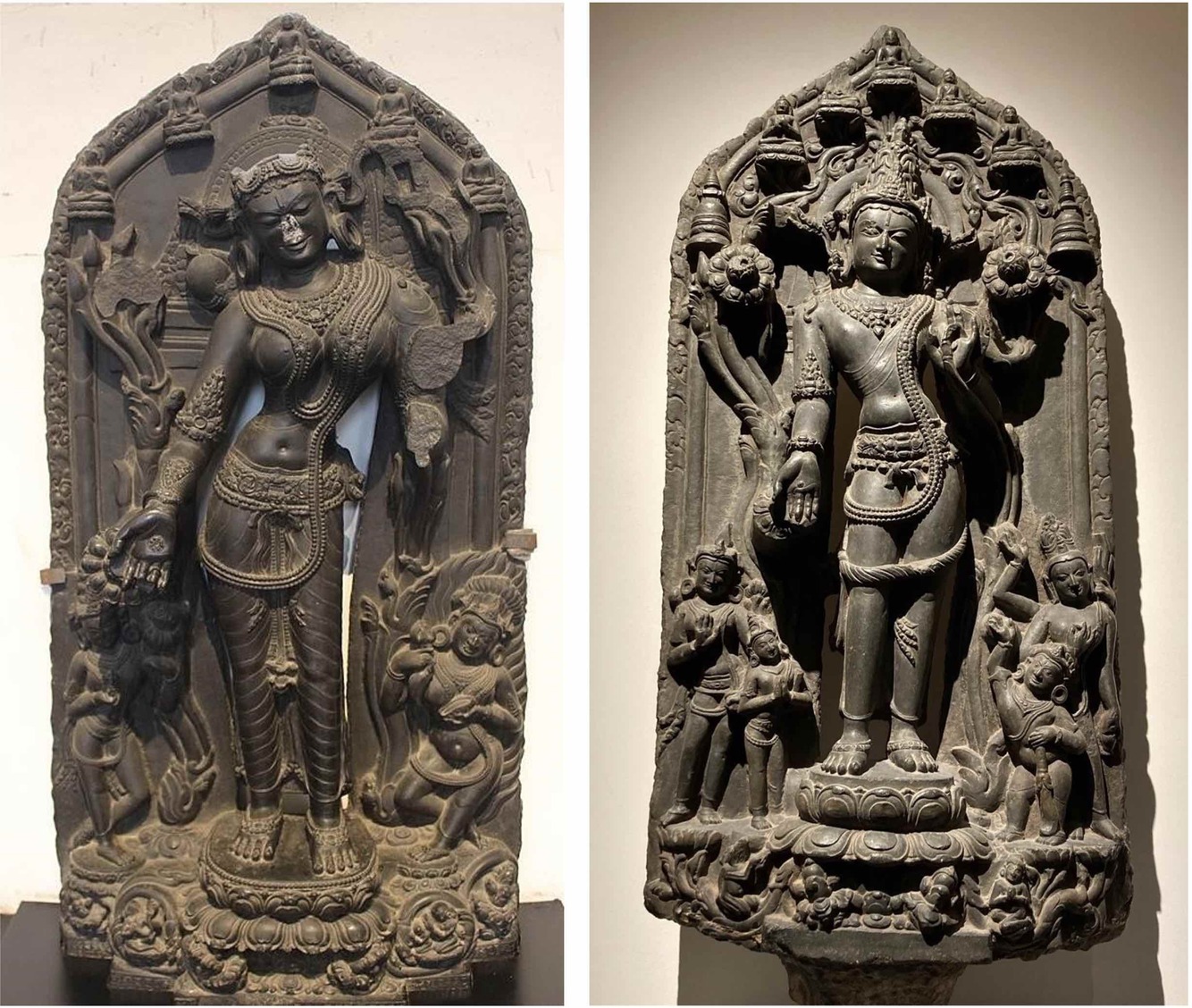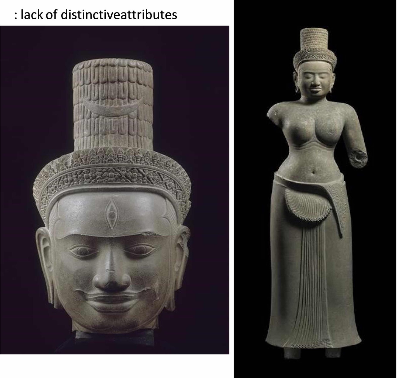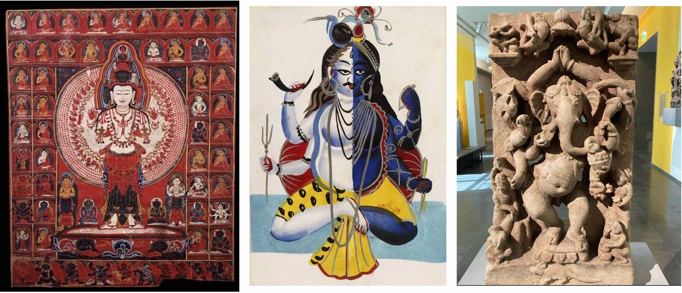 Extra limbs/heads, divine symbols (e.g., Avalokiteśvara, Cāmuṇḍā, Harihara)
