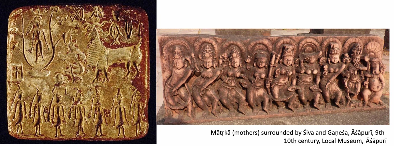 Indus seals: small narrative scenes,like mātrkā flanked by Gnesa and Siva from 10th cent.??