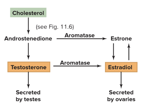 both derived from cholesterol, in presence of aromatase, androstenedione becomes estrogen. Without aromatase, androstenedione becomes testosterone