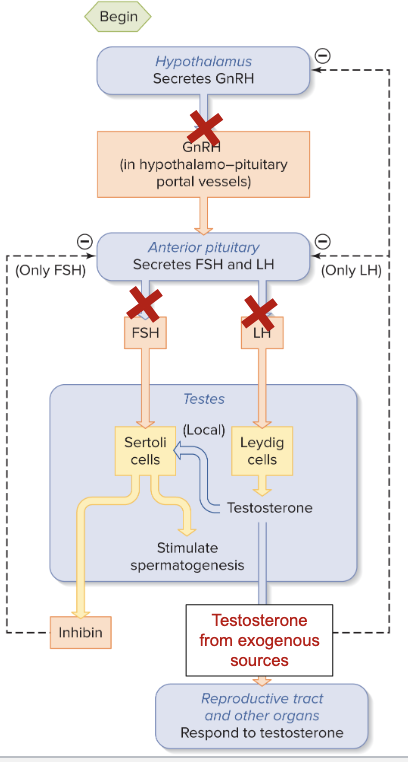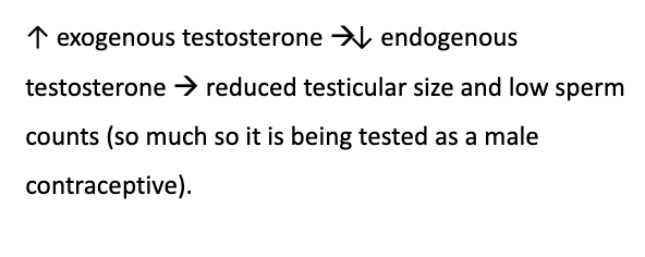 when exogeneous testosterone is increased, endogenous testosterone decreases, resulting in reduced testicular size and sperm count