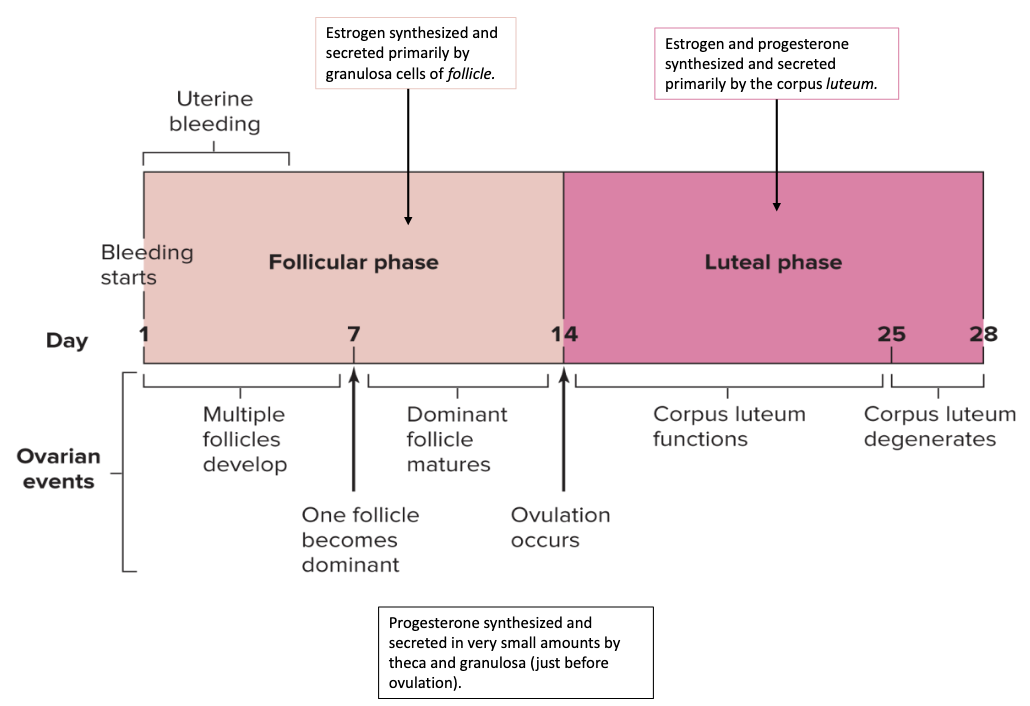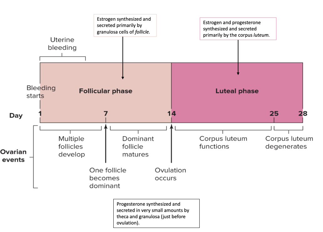 Progosterone synthesized and screted in very samll amounts by theca and granulosa (just before ovulation)