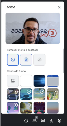 No lado direito, um recurso muito interessante, são os efeitos, por exemplo, de desfocar a imagem de fundo, dando mais ênfase à imagem principal. Se a desfocagem não ficar a contento, também há planos de fundo que podem ser adaptados, não apenas os planos de fundo disponibilizados pelo Google, mas também pode-se buscar imagens no próprio computador ou na internet.