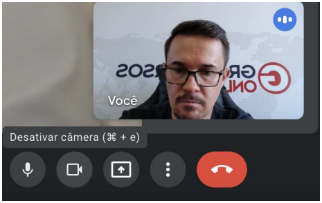 O botão vermelho é o “sair da chamada”. Se alguém estiver como organizador da reunião, ao clicar nesse botão vermelho é feita a pergunta se é para encerrar a videochamada para todos ou se a pretensão é apenas sair.