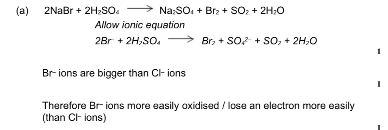 Write an equation for this reaction of sodium bromide and explain why bromide ions react differently from chloride ions.