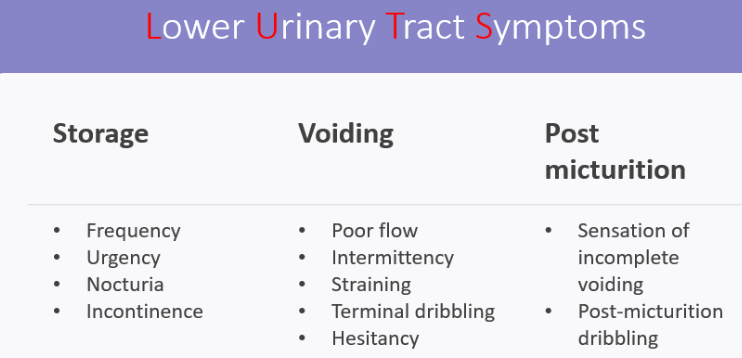 What are the 3 types of Lower Urinary Tract symptoms? Give examples of each