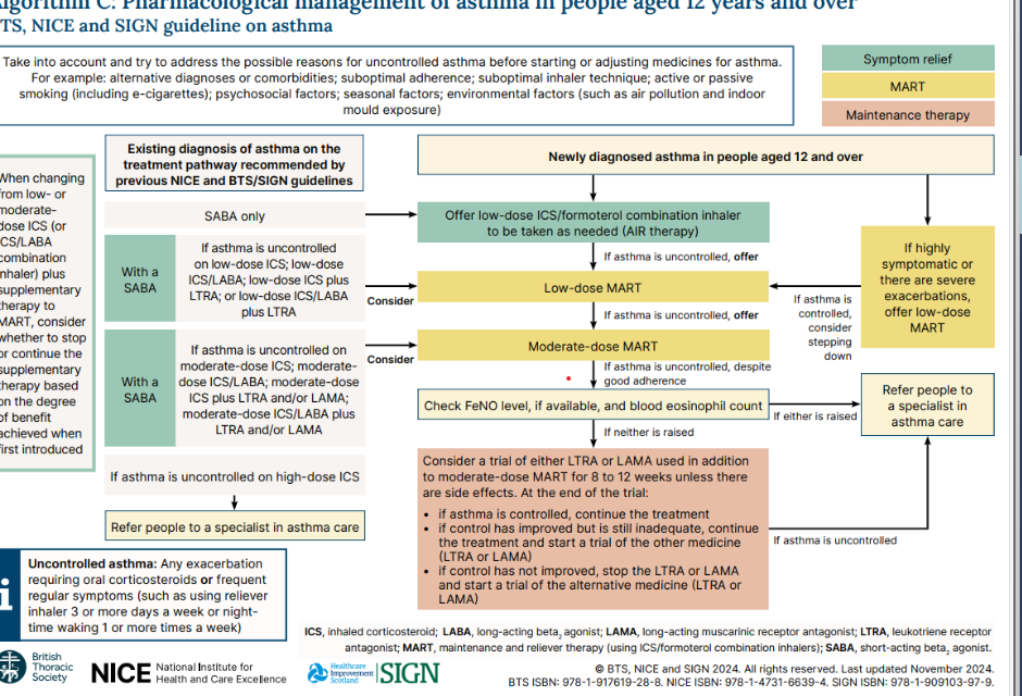 * if neither FeNO nor eosinophil count is raised, consider a trial of either a leukotriene receptor antagonist (LTRA) or a long-acting muscarinic receptor antagonist (LAMA) used in addition to moderate-dose MART