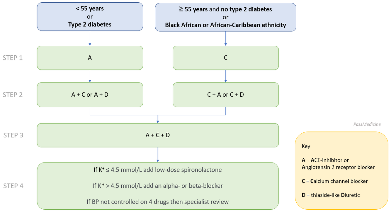 Poorly controlled hypertension, already taking an ACE inhibitor, calcium channel blocker and a standard-dose thiazide diuretic. K+ > 4.5mmol/l - add an alpha- or beta-blocker