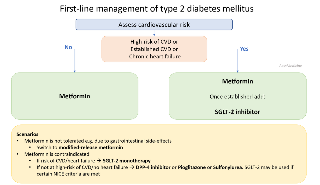 * SGLT-2 inhibitors should also be started at any point if a patient develops CVD (e.g. is diagnosed with ischaemic heart disease), a QRISK ≥ 10% or chronic heart failure
