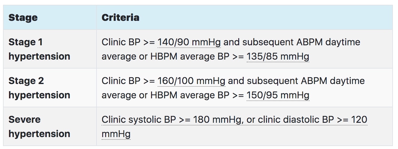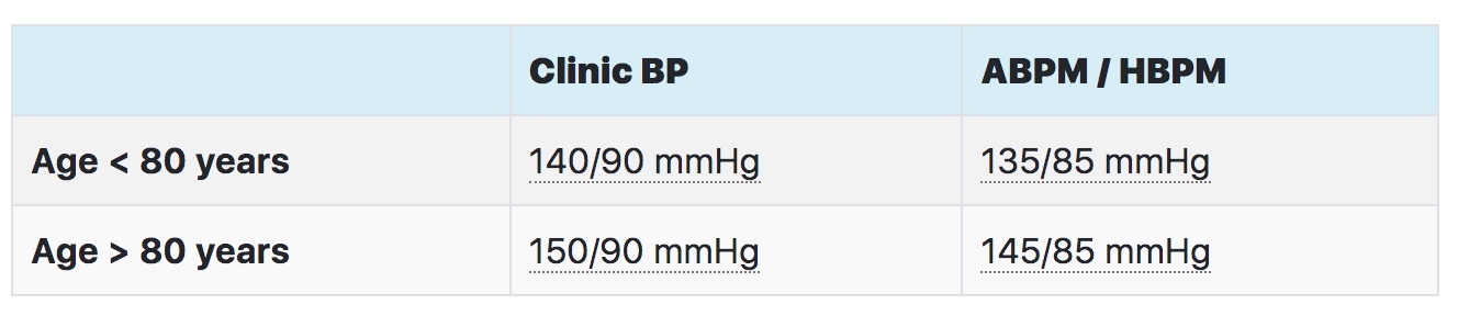 above 140/90 in the clinical setting, confirmed with ambulatory or home readings above 135/85.