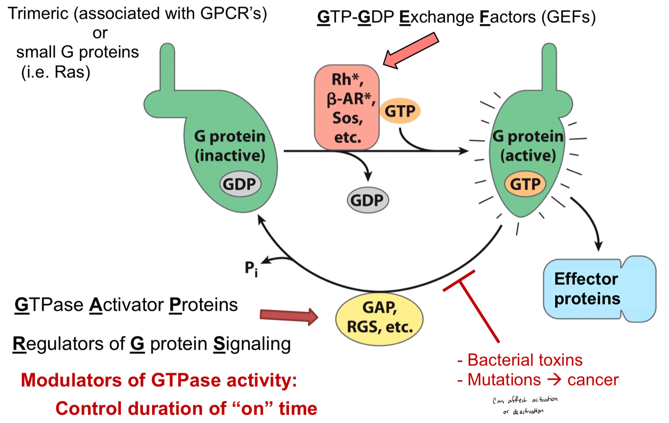 What are the functions of GEF’s (guanine nucleotide exchange factors), GAP’s (GTPase Activator Proteins), and RGS’s (Regulators of G Protein Signaling)?