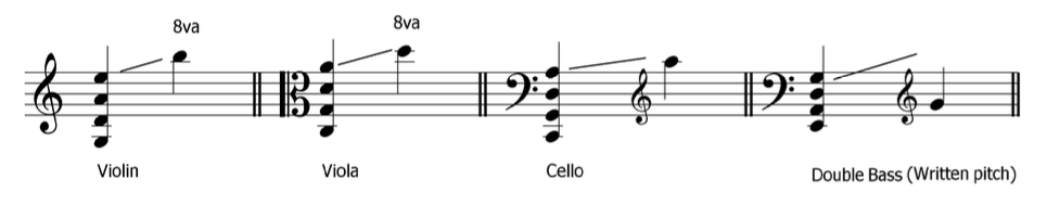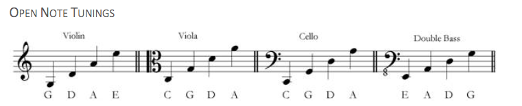 List the open string notes of all string section instruments