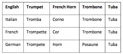 4 trumpets, 2 trombones, 4 horns,, 2 tubas