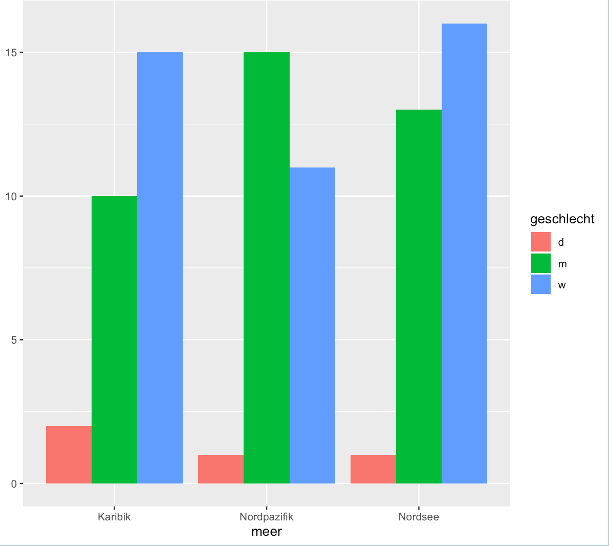 geom_bar(position=”dodge”, aes(x=meer, fill=geschlecht))