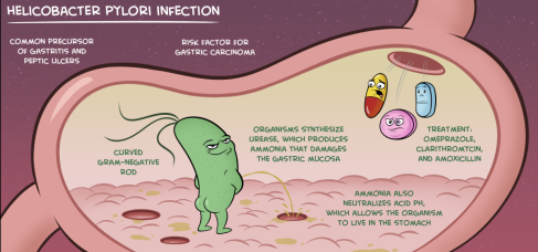 # Reverse Helicobacter pylori - natural habitat is human stomach - damages mucosa and causes ulcers
