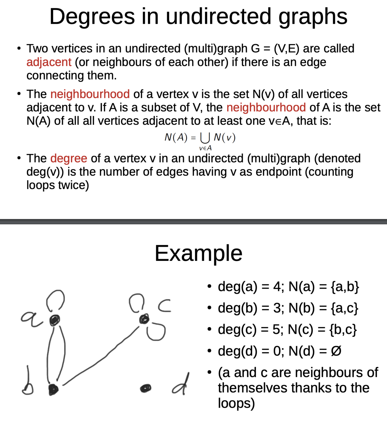 What are adjacency, neighbourhood, and degrees in undirected graphs?