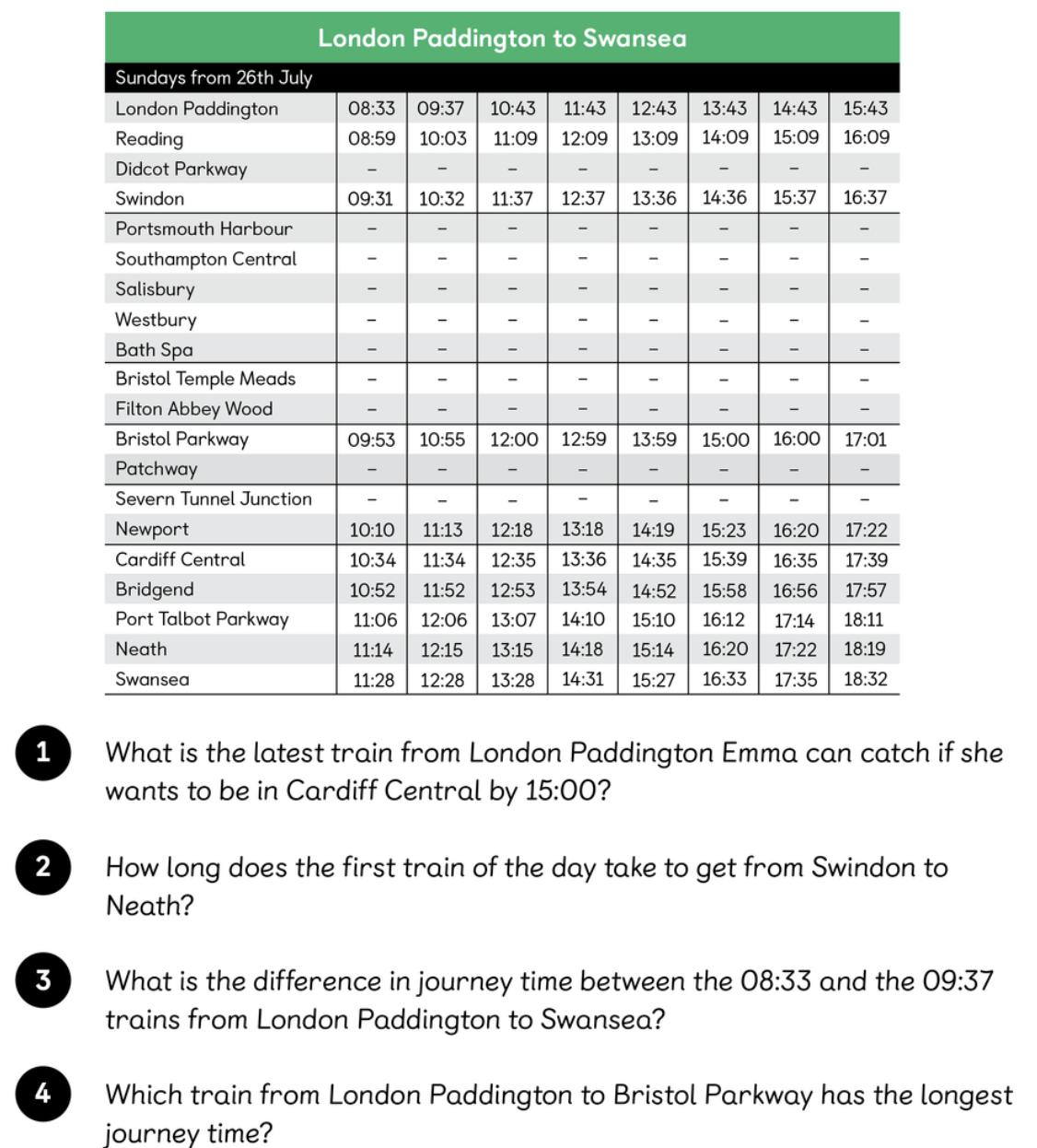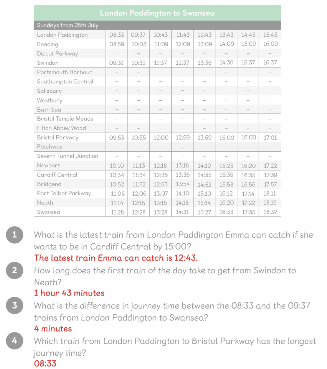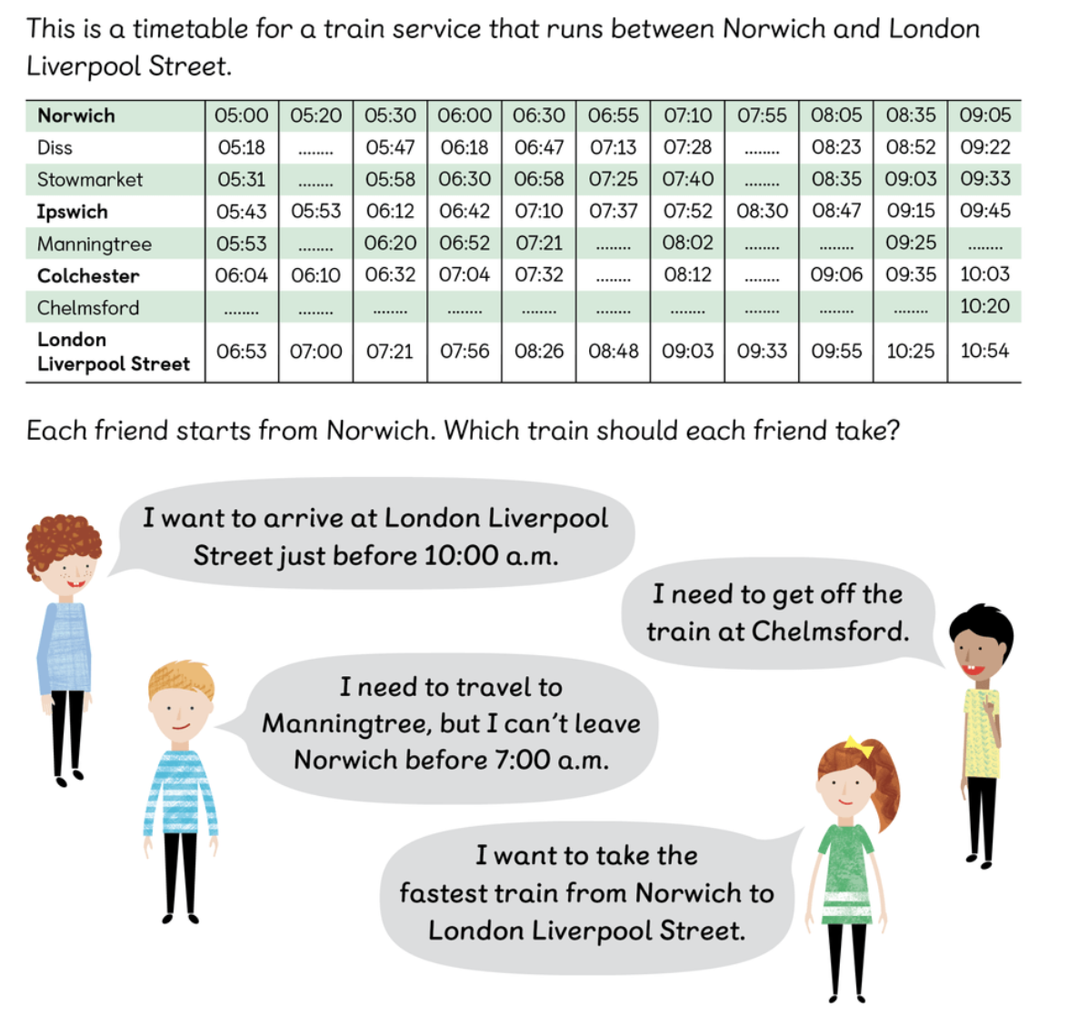 Elliot: 08:05 train from NorwichSam: 07:10 or 08:35 train from NorwichRavi: 09:05 train from NorwichHolly: 07:55 train from Norwich