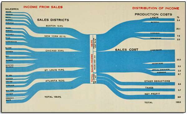 creates an image of the movement or flow of materials/resources, contrasting the source with the destination