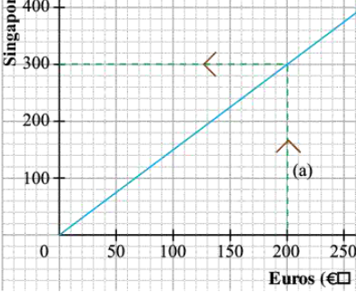 Draw a vertical line from Euro 200 until it touches the line, then draw a horizontal line to determine S$ amount