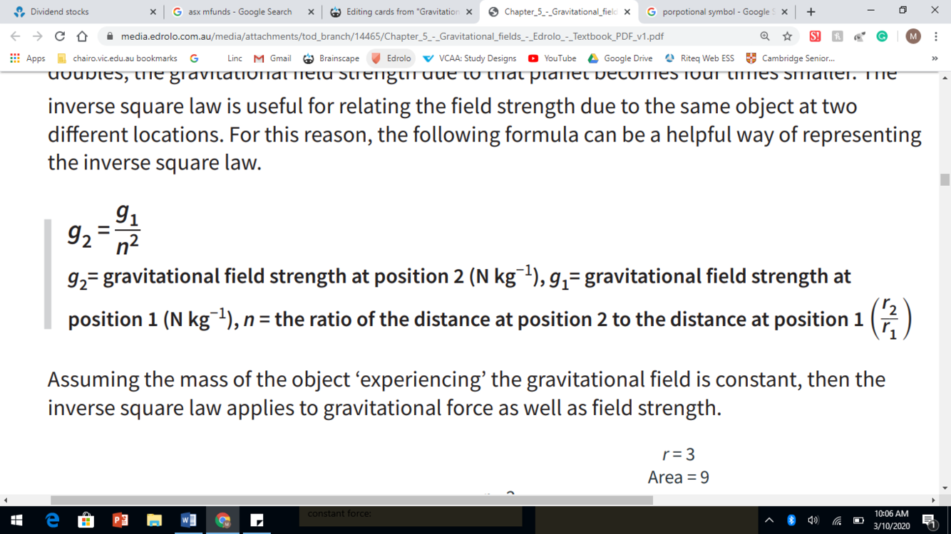 This gives the inverse square law that states that gravitational field strength is proportional to the distance giving the relationship of. g∝ 1/r2