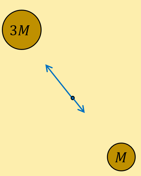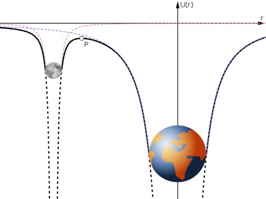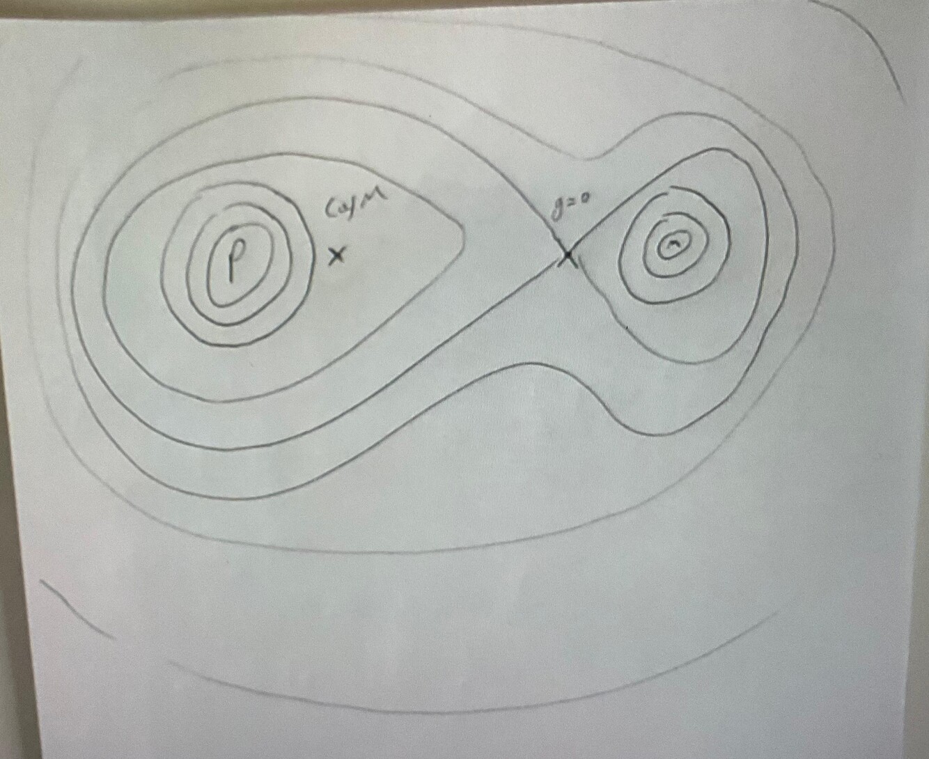 Sketch equipotential lines for a planet (mass 8m) and its moon (mass m)