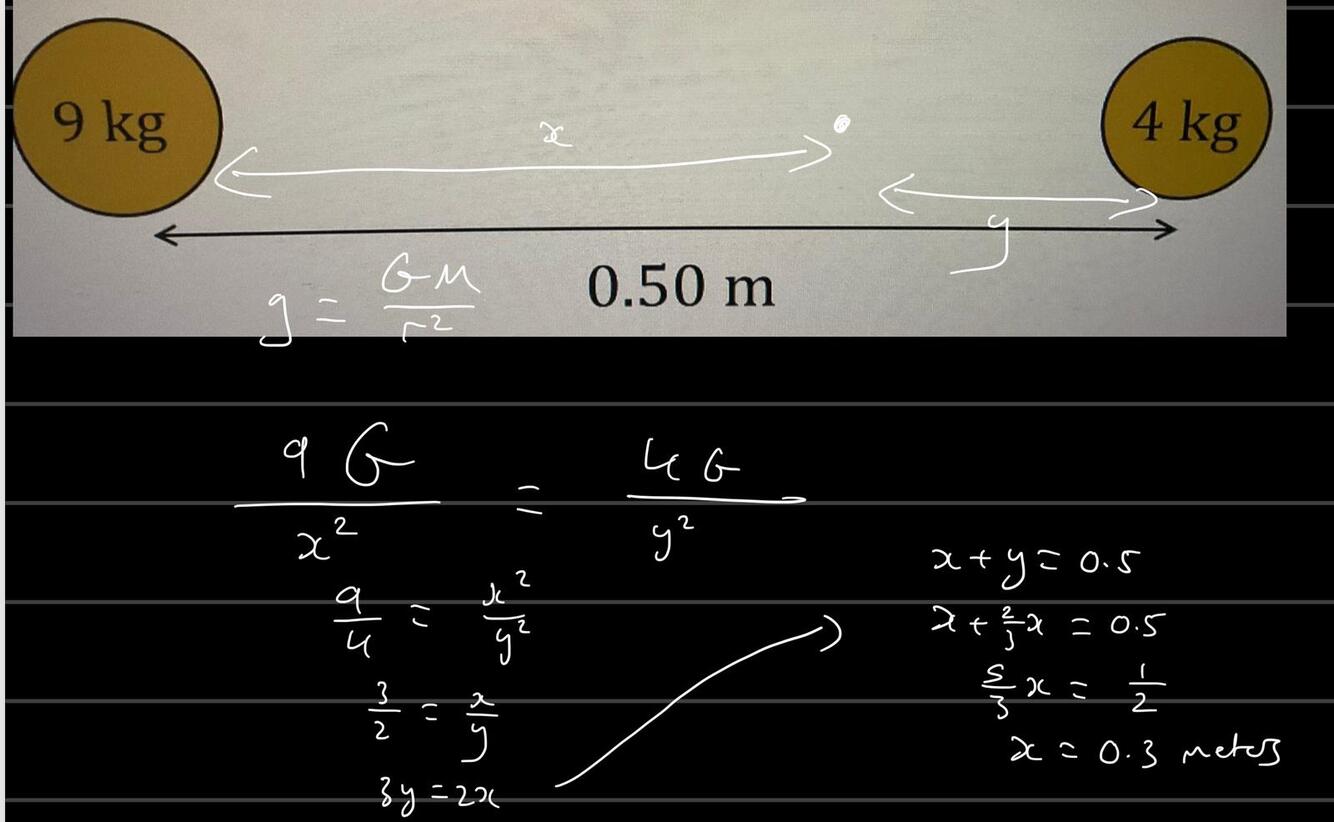 Adding Gravitational Field Strengths - example - find the distance from the 9kg mass of the position of zero field strength