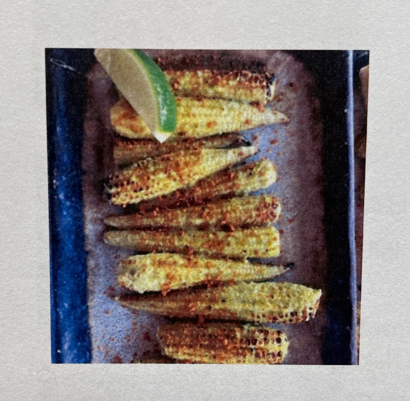 Roasted baby corn tossed with chili d’agua crème fraiche, dry miso, and rocoto powder. Chef recommends squeezing the lime wedge throughout to brighten the dish.