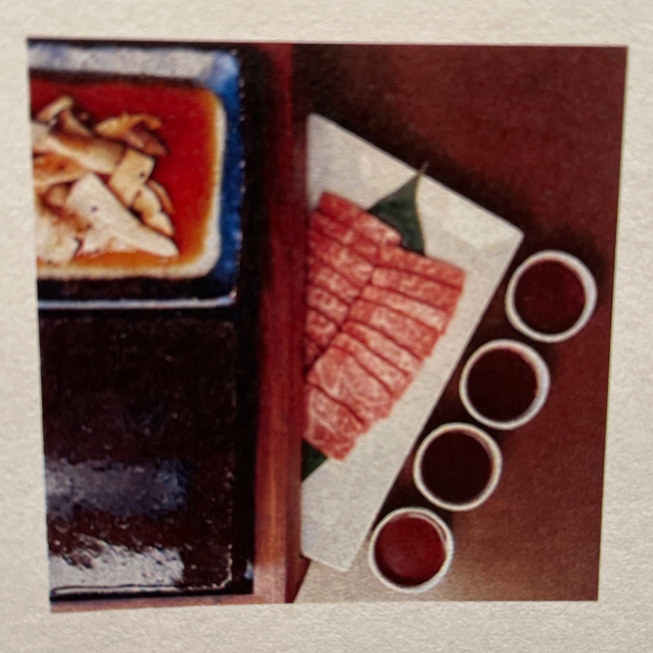Thinly sliced A5 wagyu presented at the table with a hot stone to be grilled by the guest. Served with eryngii mushrooms in soy mirin, recommended to be grilled last or around the edge of the stone.