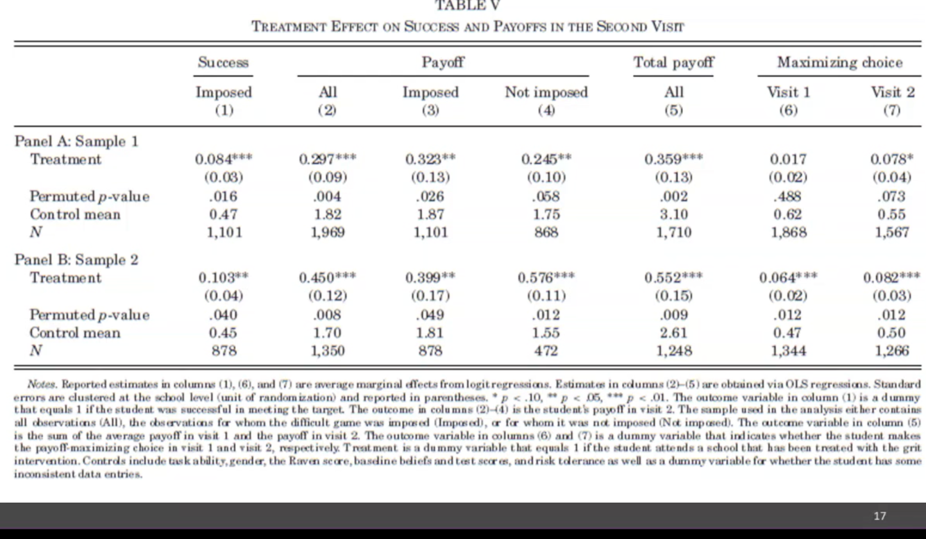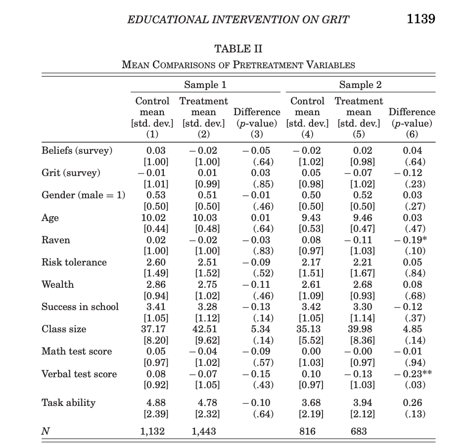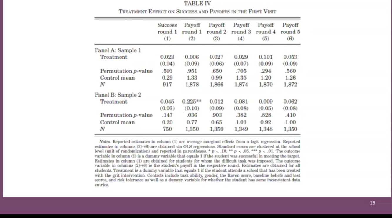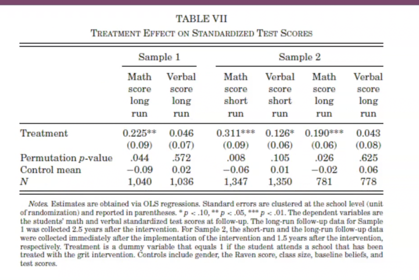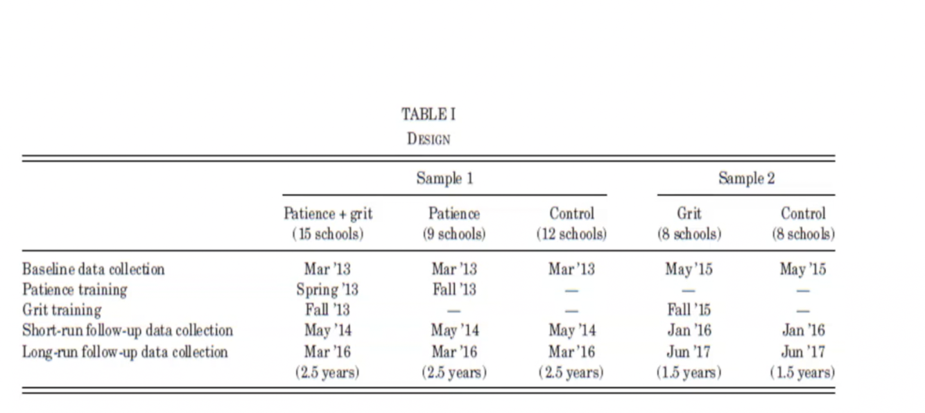 As we can see with table, the first sample, they get a course on patience and grit and just on patience. You cant really isolate the effect of grit here.