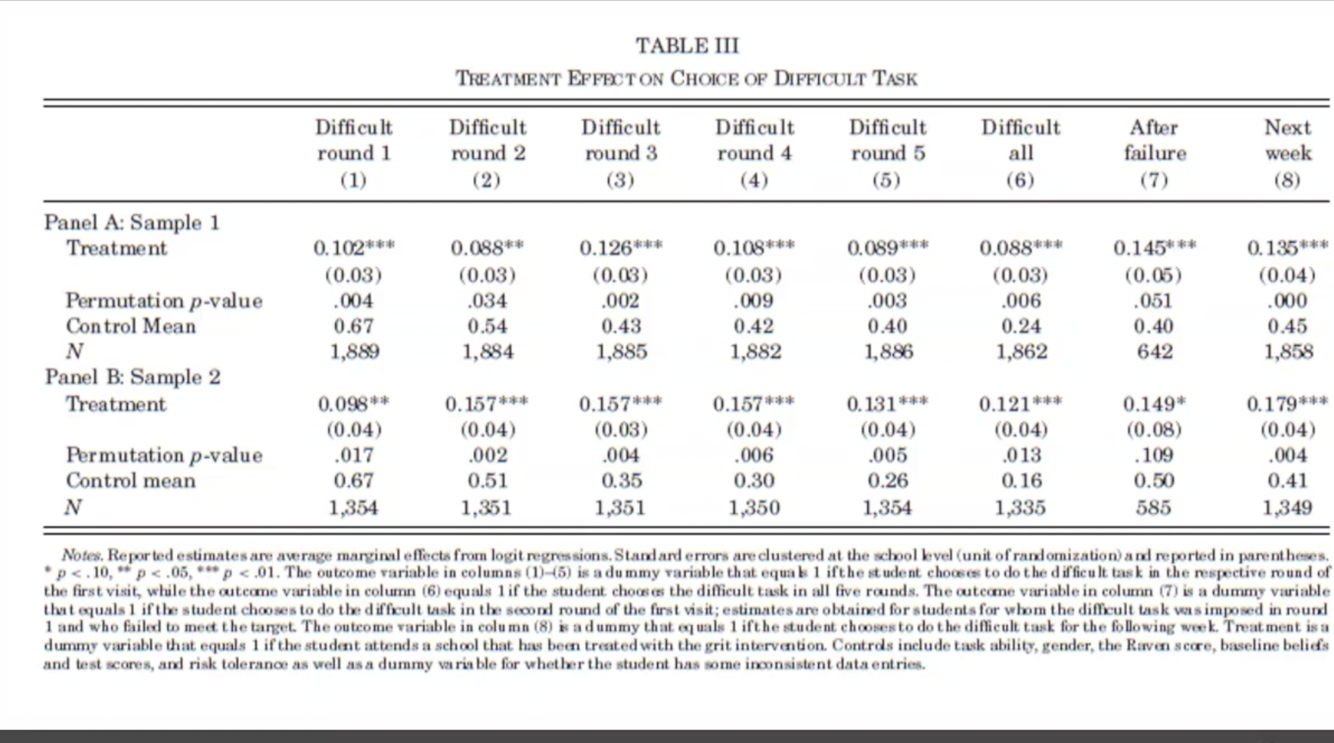 Treatment is significant everywhere. students in the grit treatment were significantly more likely to choose the difficult puzzle, same is true for the 2nd sample.