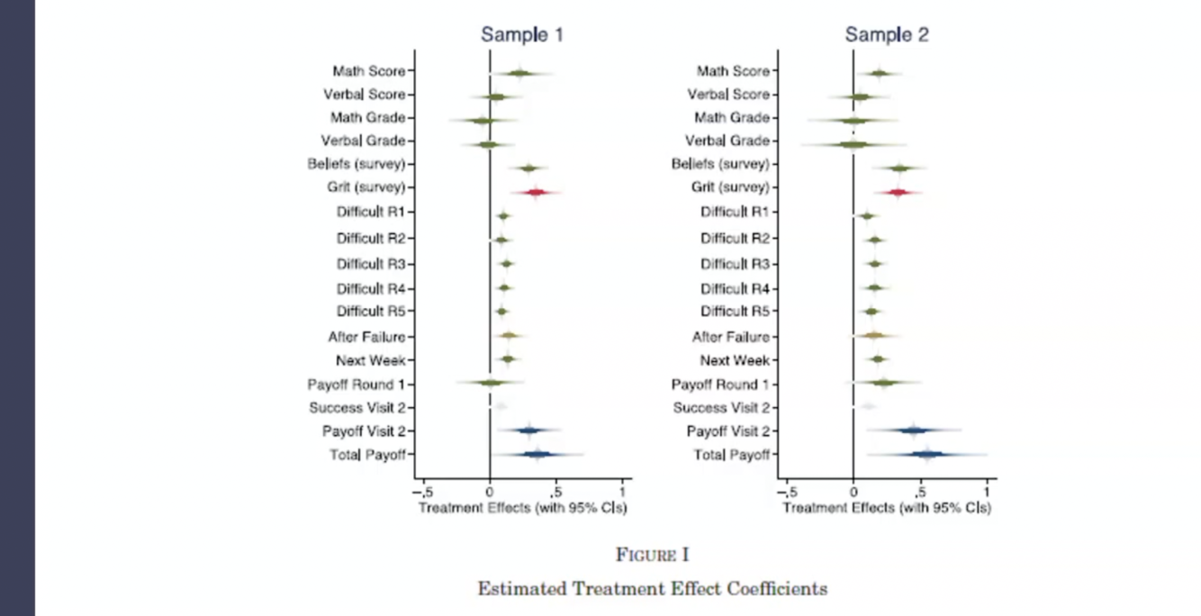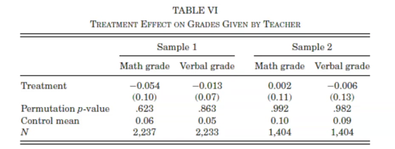 There is no difference between the kids that got the grit course and school grades because if teachers grade on curve you wouldn’t see an effect because remember it isn’t individual kids put in treatment its the whole school , so if the whole school is in grit treatment, even if whole school do better, if you grade on curve, you wont observe difference in grade.